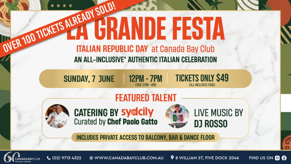 Join us for an unforgettable afternoon of culture, music, and authentic flavors at the Canada Bay Club. We are pulling out all the stops for La Grande Festa, an all-inclusive Italian feast curated to transport your senses straight to Italy.
