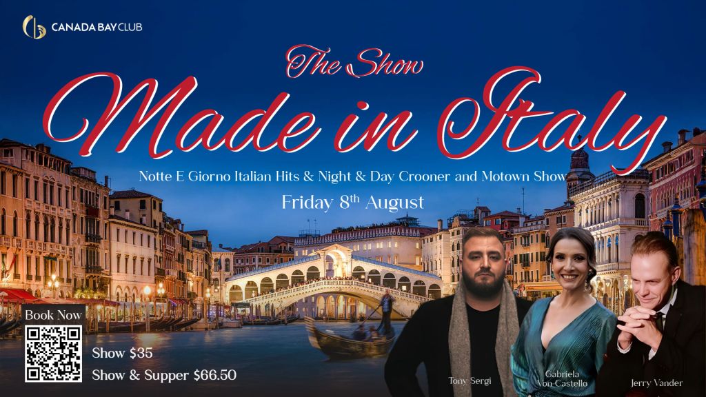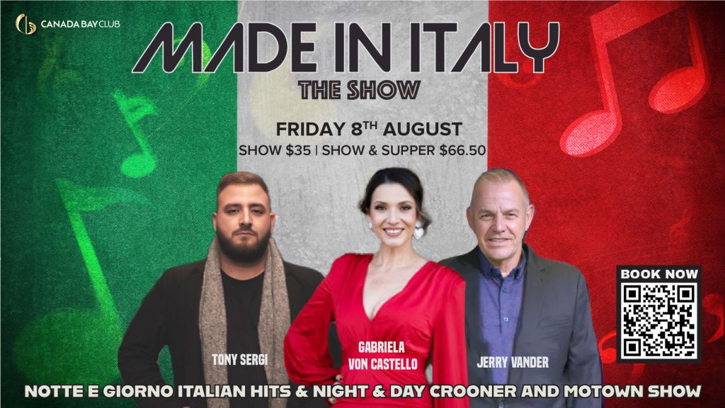 Backed by the dynamic Made in Italy Show Band—featuring Jess Ciampa on drums, David Holmes on guitar, Rada Babic on keys, and Toney Marinelli on bass guitar—this sleek live show delivers a nostalgic musical journey. Expect an evening that not only revives the spirit of Italian classics but also captures the soulful charm of an era beloved across cultures and generations.