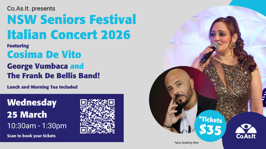 Join us at NSW Senior’s Festival Italian Concert 2026! Featuring amazing artists Cosima De Vito, George Vumbaca and The Frank De Bellis Band!