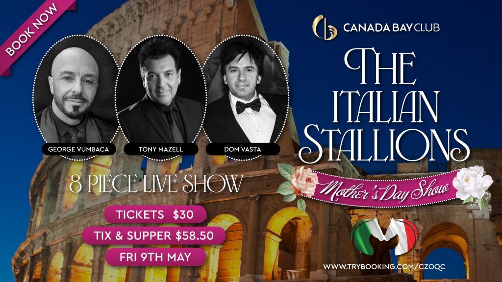 Joining forces for the first time ever, three of Australia’s premier male vocalists come together to present a Show not to be missed.Tony Mazell, George Vumbuca and Dom Vasta headline this 8 piece Show. Backed by some of the country’s finest musicians, join them as they showcase and pay tribute to the Italian classics from yesteryear which will also include some modern day hits.