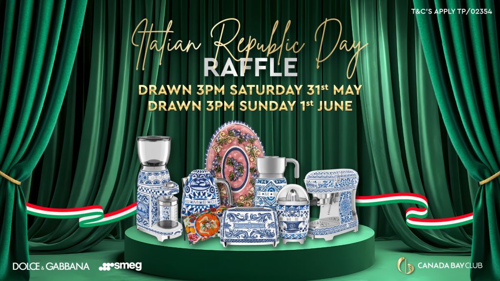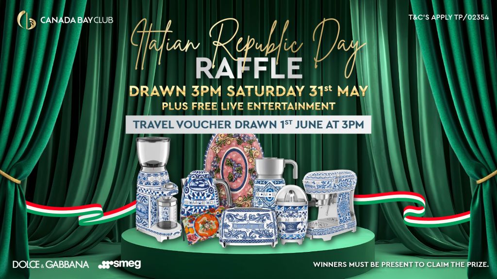 From 3pm, guests can take part in a luxury Italian goods raffle valued at over $5,000, featuring exquisite products from Dolce & Gabbana, Smeg and more. Tickets to go on sale in advance, $5 for one ticket or $20 for 5 tickets. The celebration continues into the evening with free Italian music and dancing with Sam Pellegrino & Dom Vasta in the Club auditorium. Winners must be present to claim the prize.