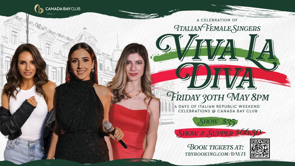 The weekend begins with Viva La Diva, a high-energy performance from three of Sydney’s premier female vocalists: Sara Mazell, Jacinta Gulisano, and Juliette Rose. This dynamic trio will take audiences on a journey through Italian musical heritage, performing beloved hits from Ricchi e Poveri, Marcella Bella, Annalisa, Giorgia, and more. Lovers of Italian music won’t want to miss this unforgettable opening night. Tickets are available now via the Canada Bay Club website.