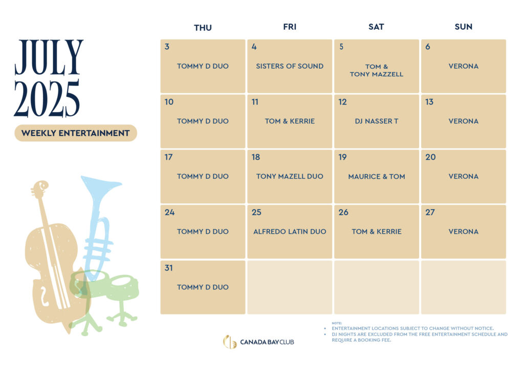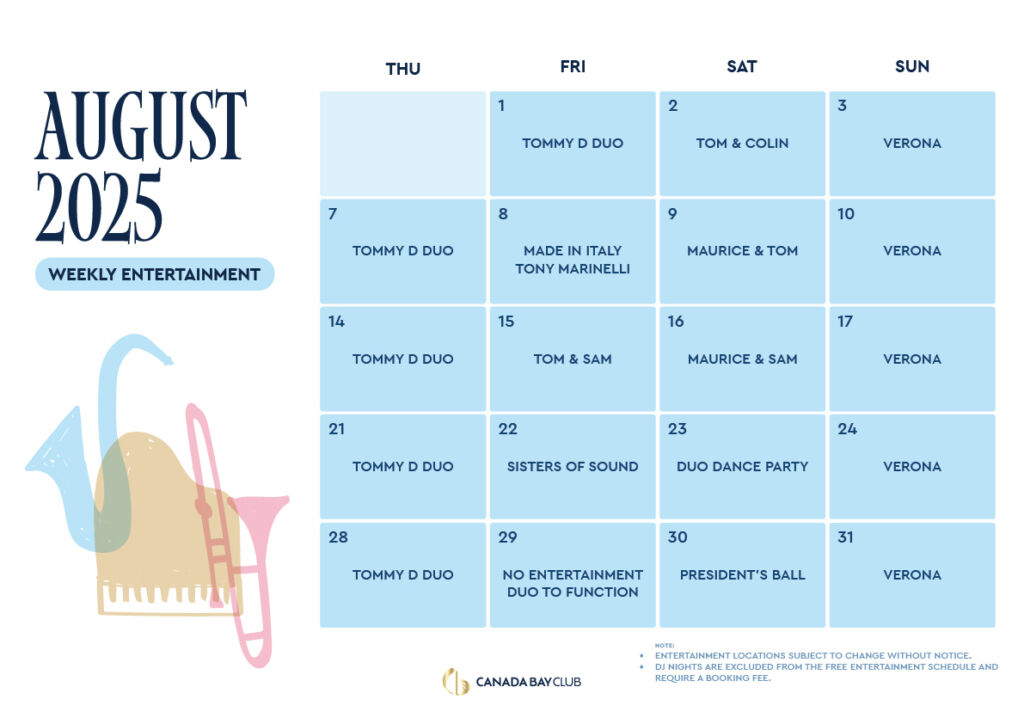 Live entertainment in the Auditorium or Canada Bay Room Level 1– don’t miss the vibes!